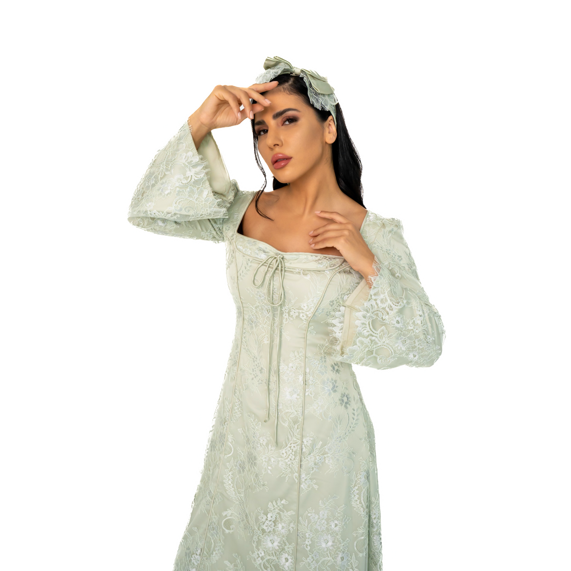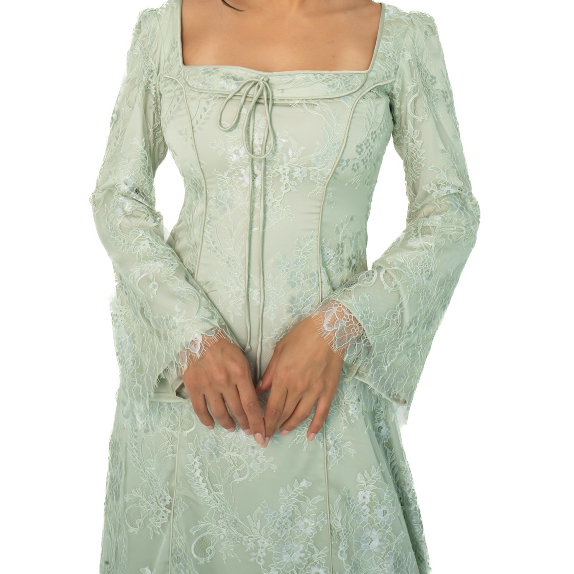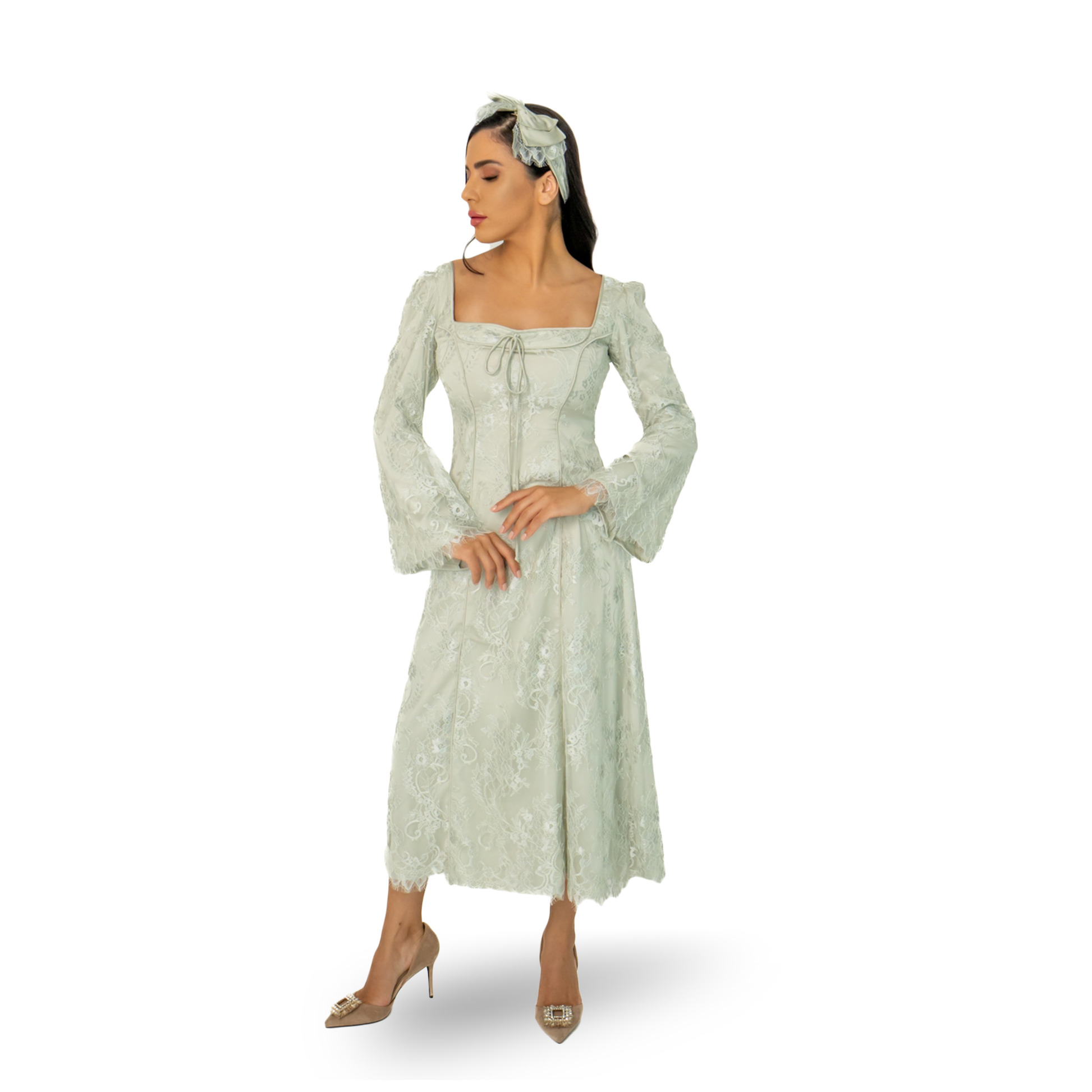 Crafted from intricate lace over a pure silk base, this one-piece design features a sculpted corset-style bodice with a subtle front-tie detail and softly flared sleeves that flow with quiet grace. The dress falls into a gentle A-line silhouette, offering structure, softness, and timeless femininity in perfect harmony.